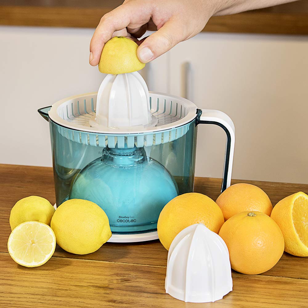 - Exprimidor eléctrico para naranjas y cítricos con 40 W de potencia. Incluye dos conos desmontables, para cítricos más pequeños o más grandes.